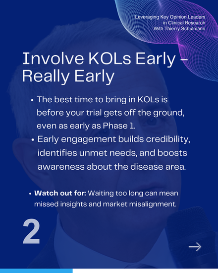 KOL involvement should begin at the earliest phase—ideally before protocol development—to align study outcomes with clinical, regulatory, and payer needs.